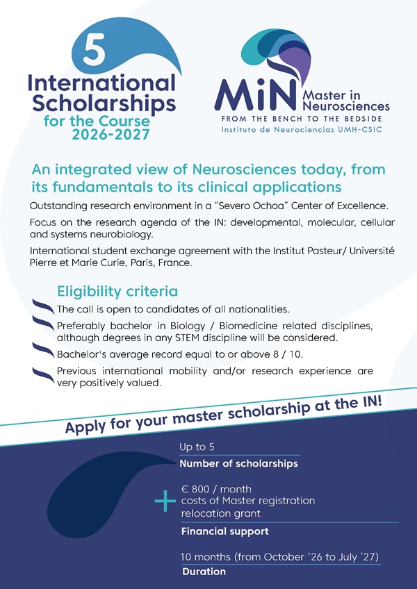 The Severo Ochoa Excellence Programme of the Institute for Neurosciences (IN), a joint center of the Miguel Hernández University of Elche (UMH) and the Spanish National Research Council (CSIC), offers up to 5 International Scholarships for the Master’s Degree in Neurosciences: from the Bench to the Bedside during the 2026-2027 academic year (October- July). These scholarships cover full Master's tuition fees, a monthly stipend of €800, and a reallocation grant.