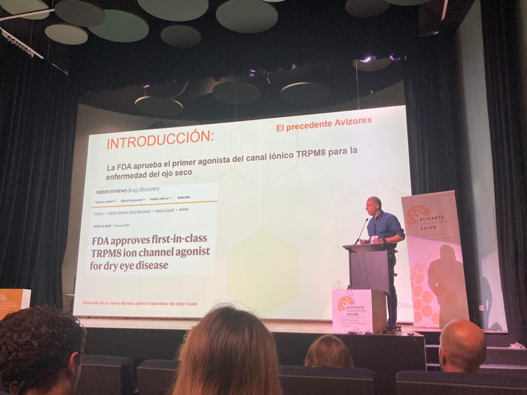 En este bloque destacó la intervención de Víctor Meseguer, que colidera el grupo de investigación de Neurobiología ocular del Instituto de Neurociencias (CSIC–UMH), quien presentó los avances de un proyecto para el desarrollo de un nuevo fármaco destinado al tratamiento del dolor ocular, un reto clínico con gran impacto en la calidad de vida de los pacientes.