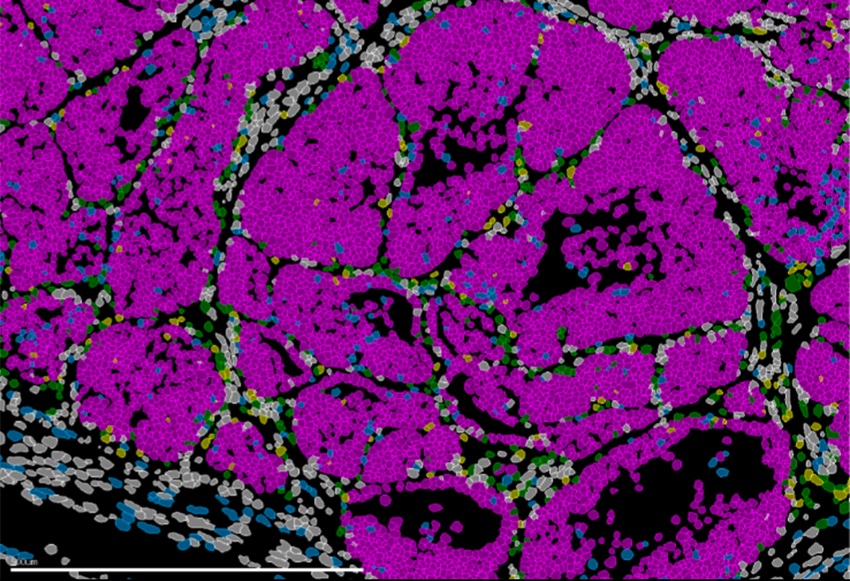 Imagen de un tumor de mama en ratón que muestra las distintas poblaciones celulares (células cancerosas en rosa). Tecnologías avanzadas de biología espacial permiten la identificación simultánea de todos los tipos celulares presentes en el tejido. Fuente: IN CSIC-UMH.