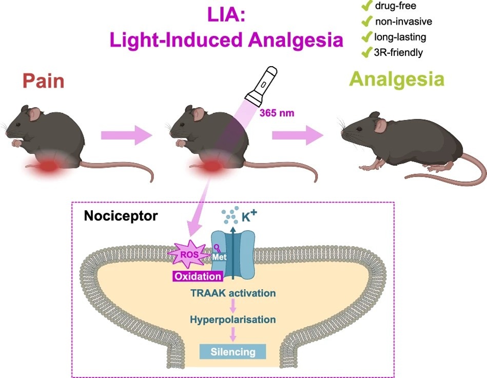 Pain management in animal experimentation is crucial for both ethical and scientific reasons, as unmanaged pain can distort physiological responses compromising data reliability. Current strategies are often invasive and pharmacology-based, introducing variability and confounding effects. Here, we present Light-Induced Analgesia, a drug-free, non-invasive method for pain relief in animals. We show that 365 nm illumination activates the pain-inhibitory TRAAK two-pore domain potassium (K2P) channel. This activation is driven by the oxidation of a native methionine at TRAAK’s regulatory fenestration site, triggering a conformational switch from its inactive (down) to active (up) state. We further demonstrate that this mechanism can be transferred to other related K2Ps via a single-point mutation, rendering them light-sensitive. In rodents, gentle skin exposure to 365 nm is sufficient to activate endogenous TRAAK, silence nociceptors, and produce potent, long-lasting analgesia that outperforms standard treatments. Light-Induced Analgesia thus offers an effective, drug-free alternative that can enhance animal welfare and experimental reliability in preclinical research.