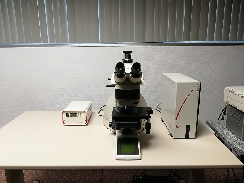 Microscopio vertical Leica DM5000B , de fluorescencia y campo claro, para la visualización de muestras fijadas. Está equipado con filtros de fluorescencia para DAPI, GFP y Cy3. Tiene objetivos secos de 2.5x, 5x, 10x, 20x y 40x