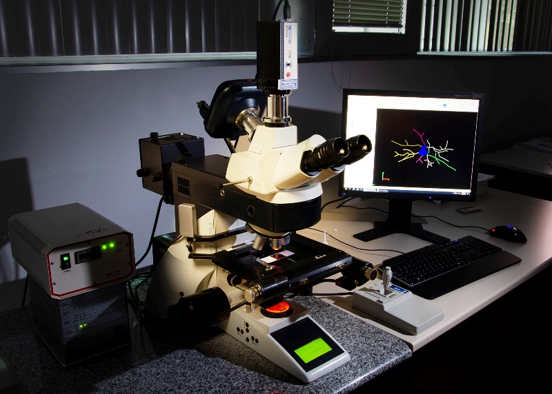 Sistema Neurolucida , para la reconstrucción y análisis de tejido de cerebro y neuronas. Se basa en un microscopio de fluorescencia y campo claro Leica DM4000. Está equipado con filtros de fluorescencia para DAPI, GFP, Cy3 y Cy5. Tiene objetivos secos de 2.5x, 10x, 20x y 40x, así como un objetivo de inmersión en aceite de 63x. La detección puede ser a través de una cámara de color (MBF CX9000) o una cámara monocroma (QImaging).