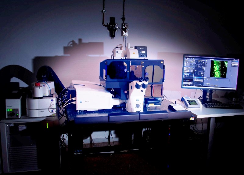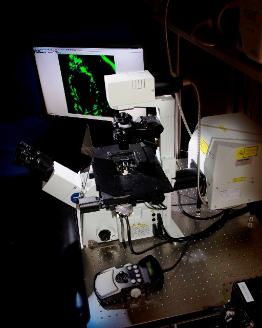 Microscopio confocal invertido Olympus FV1200, con platina motorizada XY que permite llevar a cabo experimentos de imagen en varios campos y creación de mosaicos. Está dotado de láser violeta (405nm), argón multi-línea (473, 488 y 515nm), láser 559nm y láser 635nm. Dispone de objetivos de 10x y 20x secos además de 20x, 40x y 60x de aceite.