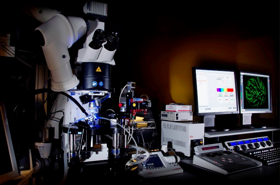 Microscopio multifotón Leica SP5 vertical, con equipamiento necesario para experimentos de imagen in vivo e in vitro combinados con registros electrofisiológicos. Dispone de láser infrarrojo MaiTaiHP DeepSee sintonizable de 690nm a 1040nm y detectores híbridos externos de alta sensibilidad para adquisición en multifotón. Con láser argón multilínea (458, 476, 488, 496 y 515nm), diodo 561nm y láser 633nm para adquisición en modo confocal. Los objetivos más utilizados son 5x seco, 25x y 63x de inmersión en agua y larga distancia de trabajo.