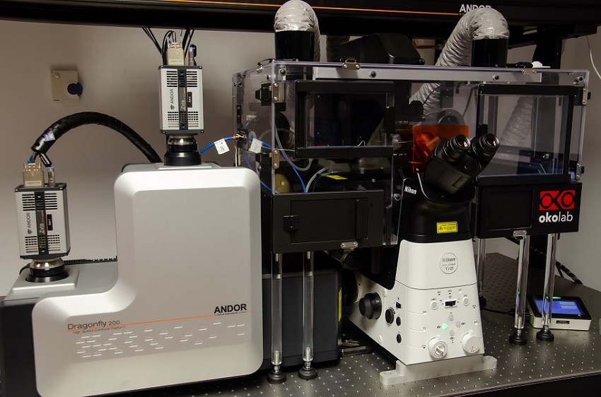 Confocal Spinning Disk Dragonfly: Microscopio confocal spinning disk para la captura en tiempo real de procesos dinámicos. Consta de sistema de incubación, platina motorizada, dos cámaras Andor Zyla 4.2 para adquisiciones duales simultáneas y cuatro líneas láser (405, 488, 561 y 637nm). Objetivos: 10x y 20x secos, 20x multiinmersión (aceite, glicerina y agua), 25x LWD de inmersión en agua, así como 40x y 60x de aceite.